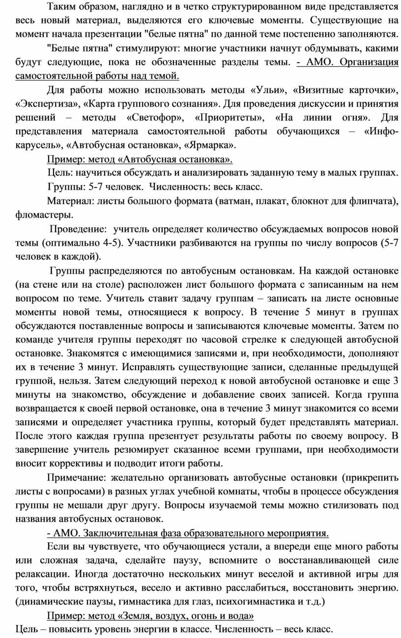 Для работы можно использовать методы «Ульи», «Визитные карточки», «Экспертиза», «Карта группового сознания». Для проведения дискуссии и принятия решений – методы «Cветофор», «Приоритеты», «На линии огня». Для представления материала самостоятельной работы обучающихся – «Инфо-карусель», «Автобусная остановка», «Ярмарка».