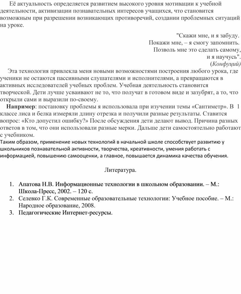 Таким образом, применение новых технологий в начальной школе способствует развитию у школьников познавательной активности, творчества, креативности, умения работать с информацией, повышению самооценки, а главное, повышается динамика качества обучения.