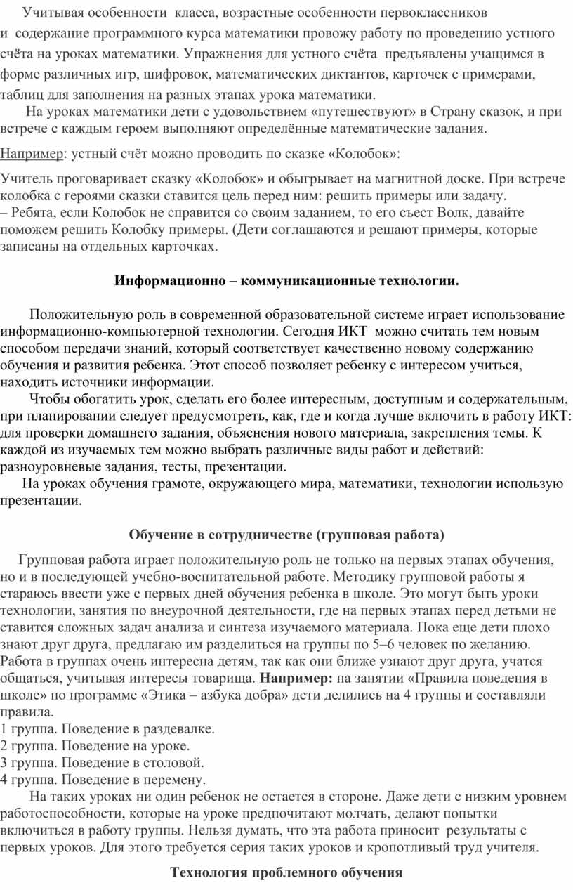 Учитывая особенности класса, возрастные особенности первоклассников и содержание программного курса математики провожу работу по проведению устного счёта на уроках математики. Упражнения для устного счёта предъявлены учащимся в форме различных игр, шифровок, математических диктантов, карточек с примерами, таблиц для заполнения на разных этапах урока математики.
