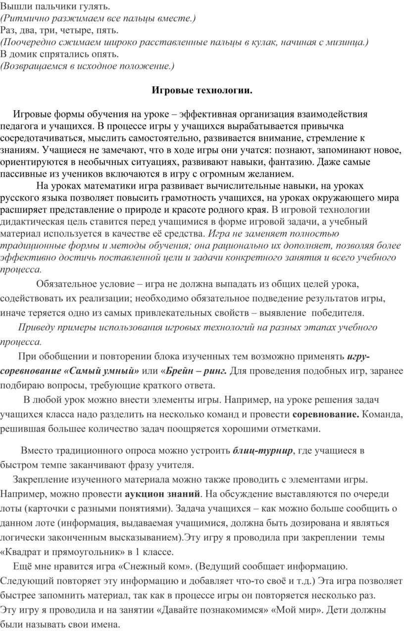 На уроках математики игра развивает вычислительные навыки, на уроках русского языка позволяет повысить грамотность учащихся, на уроках окружающего мира расширяет представление о природе и красоте родного края. В игровой технологии дидактическая цель ставится перед учащимися в форме игровой задачи, а учебный материал используется в качестве её средства. Игра не заменяет полностью традиционные формы и методы обучения; она рационально их дополняет, позволяя более эффективно достичь поставленной цели и задачи конкретного занятия и всего учебного процесса.
