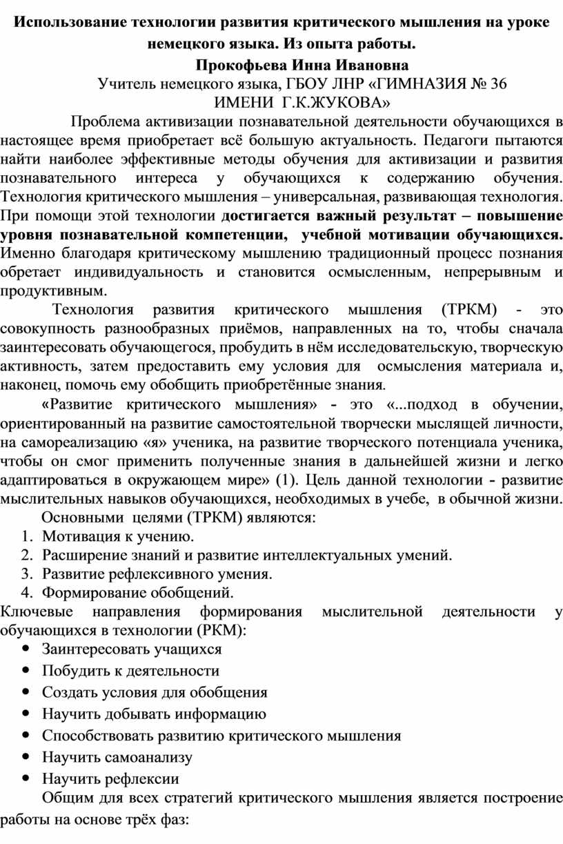 Я применяю технологию «Развитие критического мышления» на средней и старшей ступени обучения немецкому языку. На своих уроках я использую методические приёмы, формирующие критическое мышление: кластер, мозговой штурм, синквейн, таблицу «ich weiß/ ich will wissen/ ich habe erfahren, инсерт, 5-«w» и т.д. Эти приёмы позволяют организовать учебно-познавательную деятельность обучающихся, способствуют развитию мыслительных операций (анализ, синтез, классификация, обобщение, сравнение, аналогия).