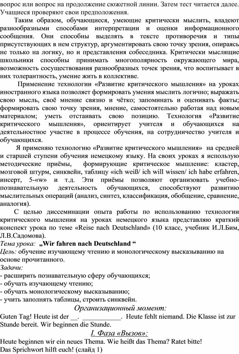 С целью диссеминации опыта работы по использованию технологии критического мышления на уроках немецкого языка представляю краткий конспект урока по теме «Reise nach Deutschland» (10 класс, учебник И.Л.Бим, Л.В.Садомова).