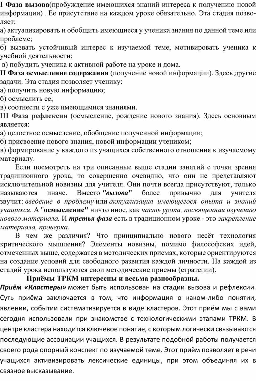 Технология развития критического мышления (ТРКМ) - это совокупность разнообразных приёмов, направленных на то, чтобы сначала заинтересовать обучающегося, пробудить в нём исследовательскую, творческую активность, затем предоставить ему условия для осмысления материала и, наконец, помочь ему обобщить приобретённые знания.