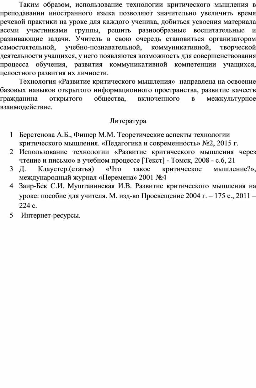 1 Берстенова А.Б., Фишер М.М. Теоретические аспекты технологии критического мышления. «Педагогика и современность» №2, 2015 г.