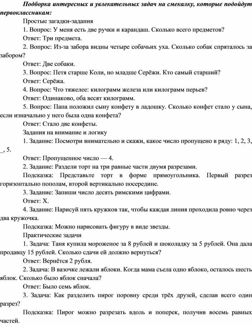 Подборка интересных и увлекательных задач на смекалку, которые подойдут первоклассникам: