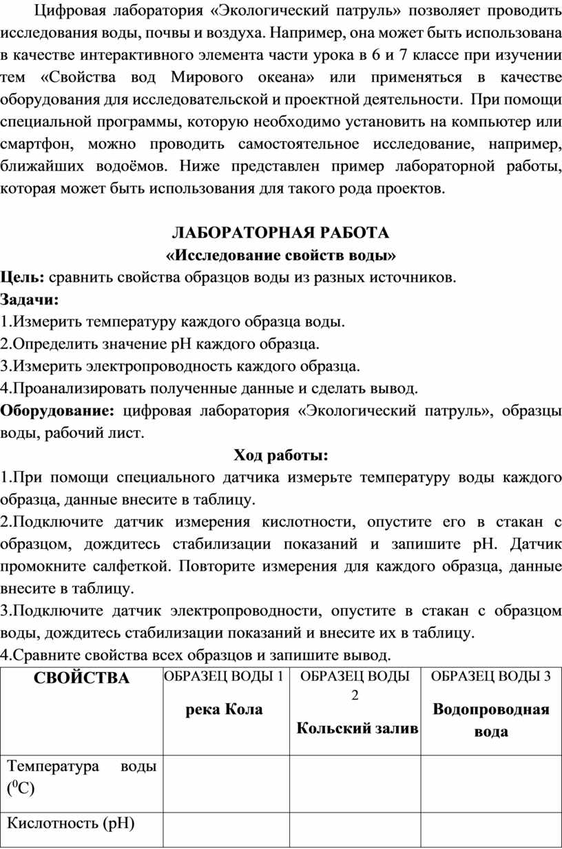 Цифровая лаборатория «Экологический патруль» позволяет проводить исследования воды, почвы и воздуха. Например, она может быть использована в качестве интерактивного элемента части урока в 6 и 7 классе при изучении тем «Свойства вод Мирового океана» или применяться в качестве оборудования для исследовательской и проектной деятельности. При помощи специальной программы, которую необходимо установить на компьютер или смартфон, можно проводить самостоятельное исследование, например, ближайших водоёмов. Ниже представлен пример лабораторной работы, которая может быть использования для такого рода проектов.