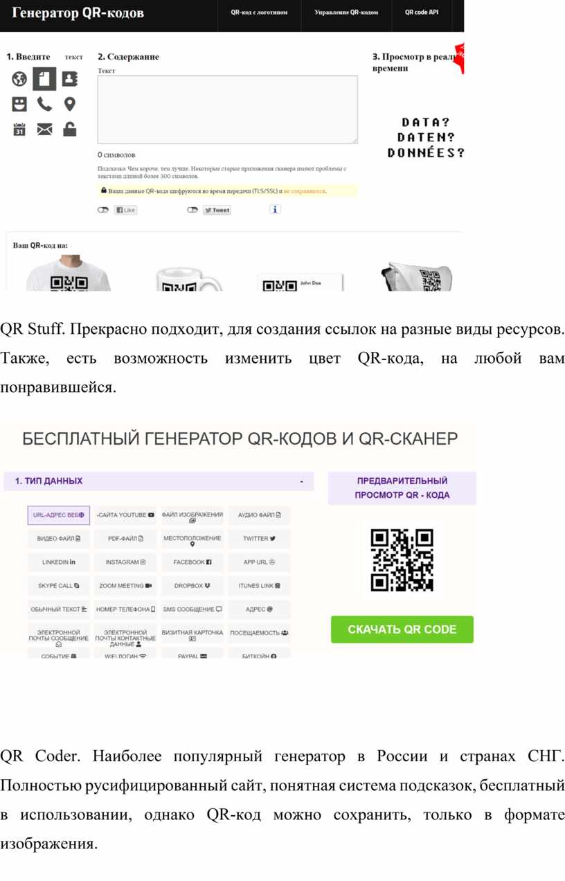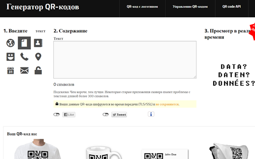 QR Coder. Наиболее популярный генератор в России и странах СНГ. Полностью русифицированный сайт, понятная система подсказок, бесплатный в использовании, однако QR-код можно сохранить, только в формате изображения.