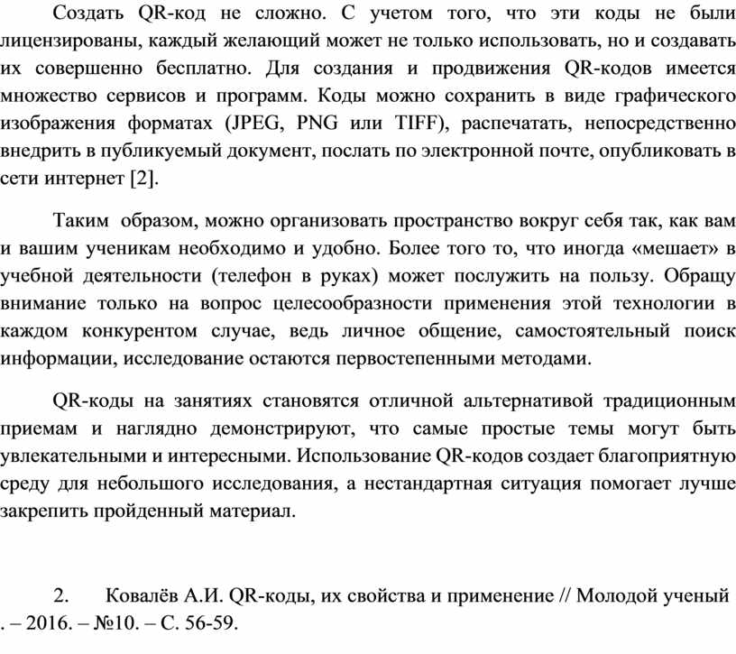 2. Ковалёв А.И. QR-коды, их свойства и применение // Молодой ученый . – 2016. – №10. – С. 56-59.