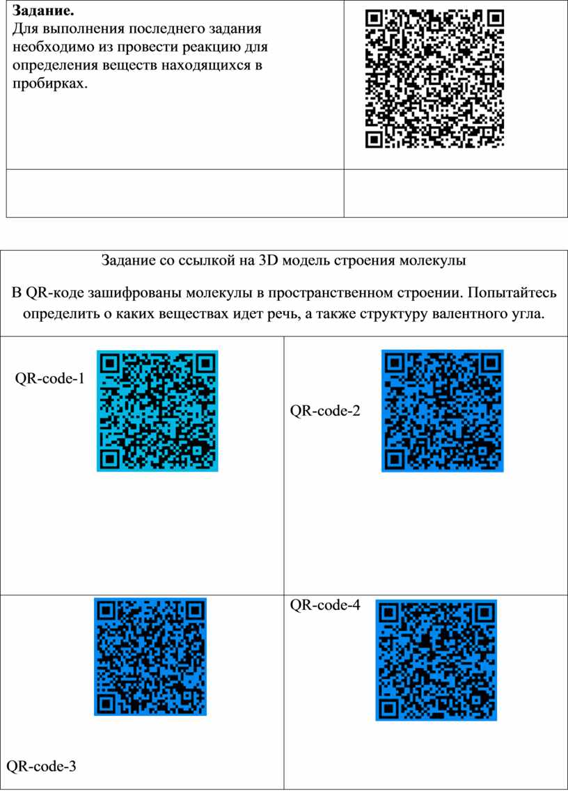 Задание со ссылкой на 3D модель строения молекулы В QR-коде зашифрованы молекулы в пространственном строении. Попытайтесь определить о каких веществах идет речь, а также структуру валентного угла. |