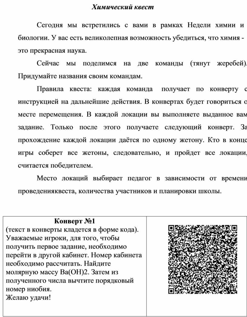 Конверт №1 (текст в конверты кладется в форме кода). Уважаемые игроки, для того, чтобы получить первое задание, необходимо перейти в другой кабинет. Номер кабинета необходимо рассчитать. Найдите молярную массу Ва(ОН)2. Затем из полученного числа вычтите порядковый номер ниобия. Желаю удачи! |
