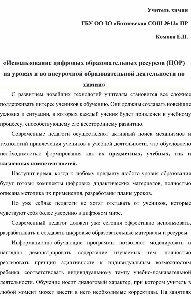 «Использование цифровых образовательных ресурсов (ЦОР) на уроках и во внеурочной образовательной деятельности по химии»