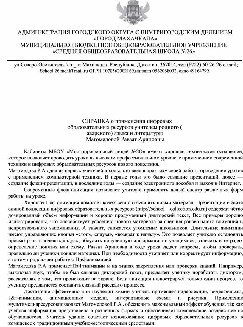 СПРАВКА о применении цифровых образовательных ресурсов учителем родного ( аварского) языка и литературы