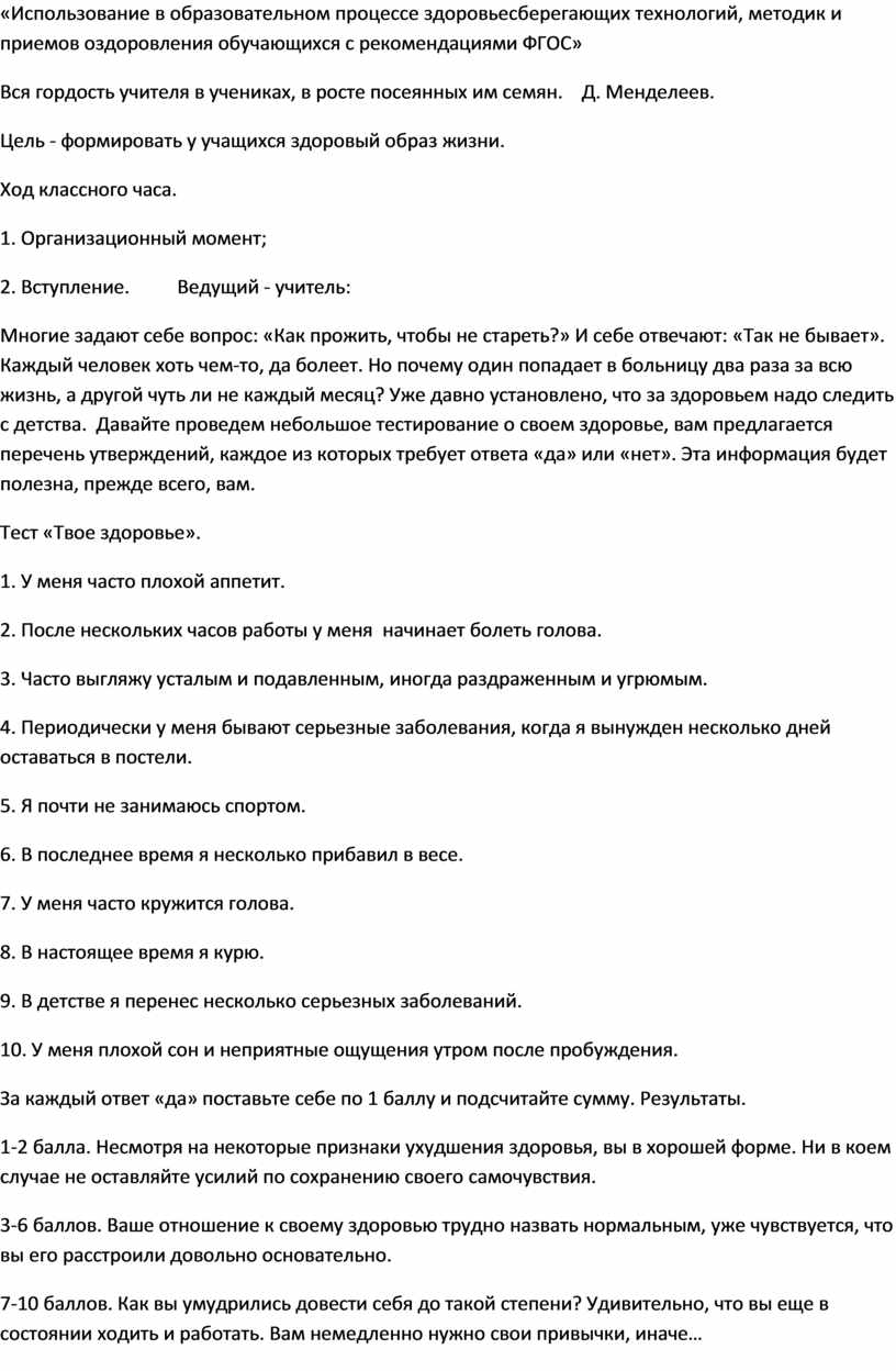 «Использование в образовательном процессе здоровьесберегающих технологий, методик и приемов оздоровления обучающихся с рекомендациями ФГОС»