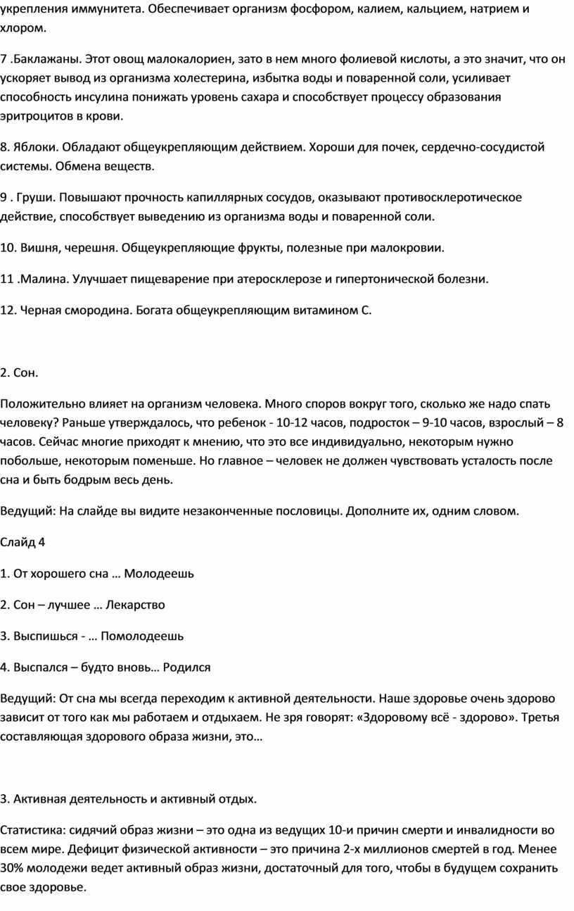 Ведущий: Мы поговорили с вами о неправильном питании, а теперь назовем продукты, которые полезно есть, чтобы оставаться здоровым: фрукты, овощи, рыбу, бобовые и т. д.