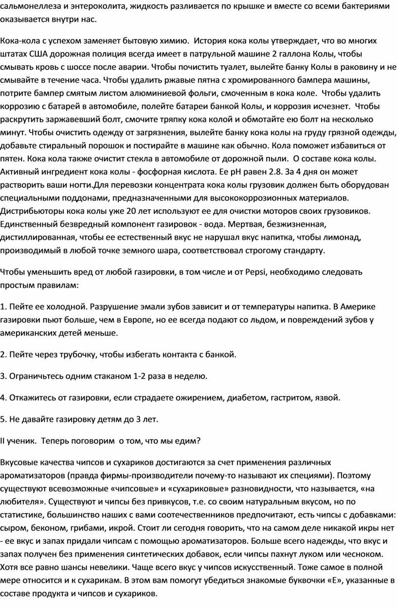 Кока-кола с успехом заменяет бытовую химию. История кока колы утверждает, что во многих штатах США дорожная полиция всегда имеет в патрульной машине 2 галлона Колы, чтобы смывать кровь с шоссе после аварии. Чтобы почистить туалет, вылейте банку Колы в раковину и не смывайте в течение часа. Чтобы удалить ржавые пятна с хромированного бампера машины, потрите бампер смятым листом алюминиевой фольги, смоченным в кока коле. Чтобы удалить коррозию с батарей в автомобиле, полейте батареи банкой Колы, и коррозия исчезнет. Чтобы раскрутить заржавевший болт, смочите тряпку кока колой и обмотайте ею болт на несколько минут. Чтобы очистить одежду от загрязнения, вылейте банку кока колы на груду грязной одежды, добавьте стиральный порошок и постирайте в машине как обычно. Кола поможет избавиться от пятен. Кока кола также очистит стекла в автомобиле от дорожной пыли. О составе кока колы. Активный ингредиент кока колы - фосфорная кислота. Ее рН равен 2.8. За 4 дня он может растворить ваши ногти.Для перевозки концентрата кока колы грузовик должен быть оборудован специальными поддонами, предназначенными для высококоррозионных материалов. Дистрибьюторы кока колы уже 20 лет используют ее для очистки моторов своих грузовиков. Единственный безвредный компонент газировок - вода. Мертвая, безжизненная, дистиллированная, чтобы ее естественный вкус не нарушал вкус напитка, чтобы лимонад, производимый в любой точке земного шара, соответствовал строгому стандарту.
