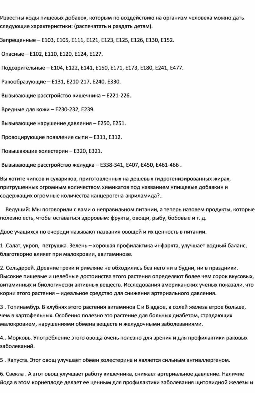 Известны коды пищевых добавок, которым по воздействию на организм человека можно дать следующие характеристики: (распечатать и раздать детям).