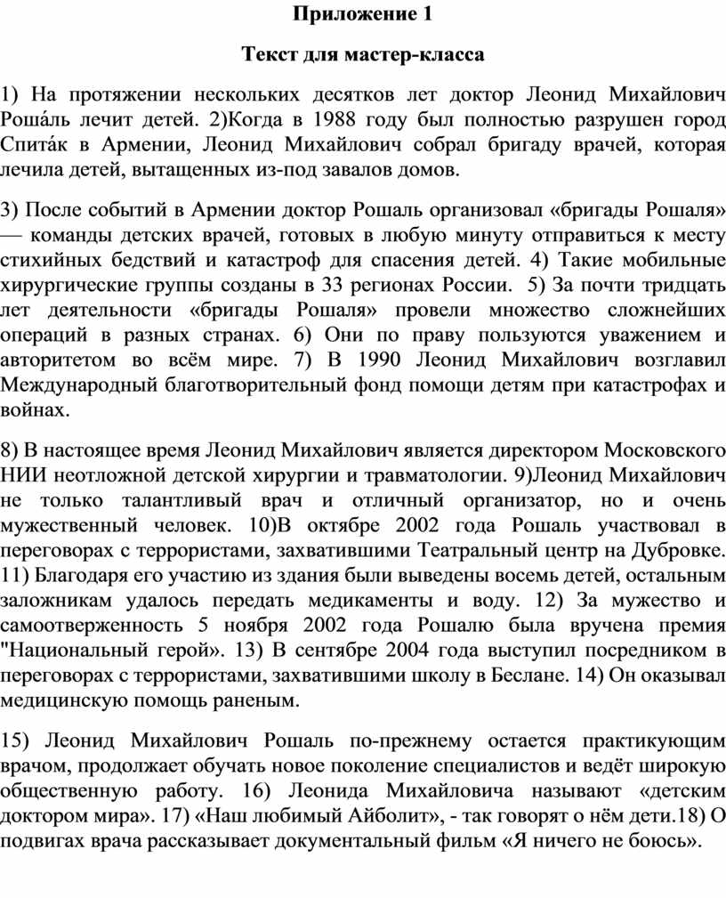 1) На протяжении нескольких десятков лет доктор Леонид Михайлович Роша́ль лечит детей. 2)Когда в 1988 году был полностью разрушен город Спита́к в Армении, Леонид Михайлович собрал бригаду врачей, которая лечила детей, вытащенных из-под завалов домов.
