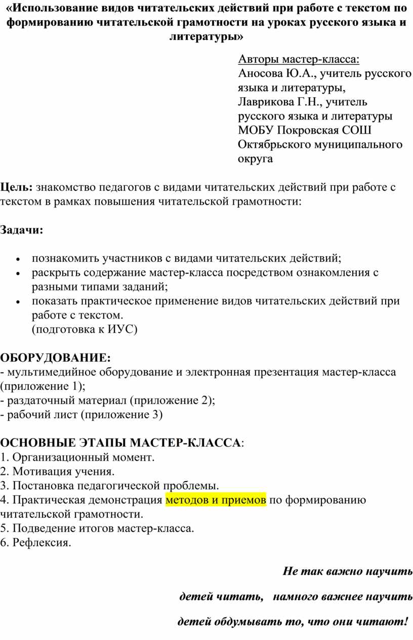 Цель: знакомство педагогов с видами читательских действий при работе с текстом в рамках повышения читательской грамотности: