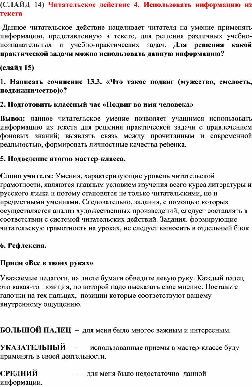 (СЛАЙД 14) Читательское действие 4. Использовать информацию из текста