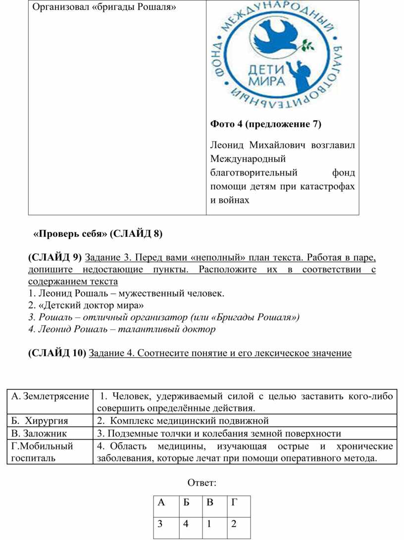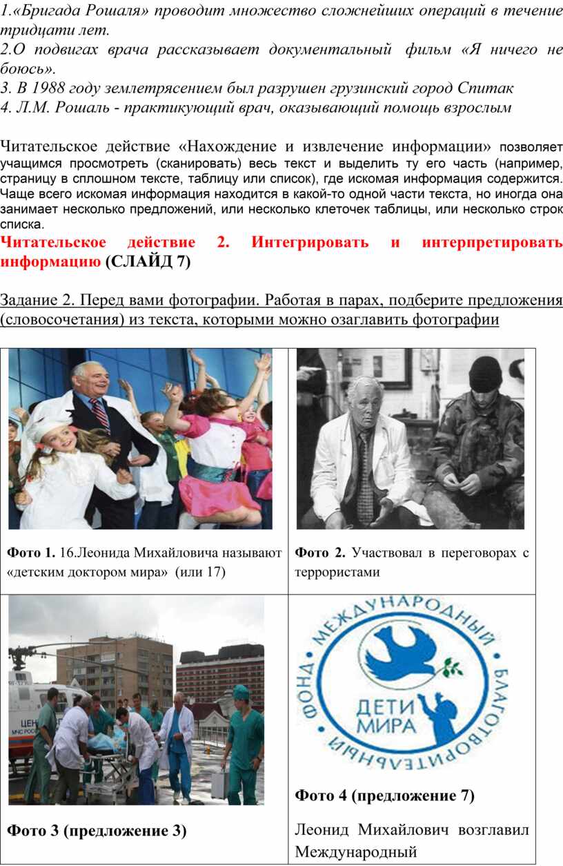3) После событий в Армении доктор Рошаль организовал «бригады Рошаля» — команды детских врачей, готовых в любую минуту отправиться к месту стихийных бедствий и катастроф для спасения детей. 4) Такие мобильные хирургические группы созданы в 33 регионах России. 5) За почти тридцать лет деятельности «бригады Рошаля» провели множество сложнейших операций в разных странах. 6) Они по праву пользуются уважением и авторитетом во всём мире. 7) В 1990 Леонид Михайлович возглавил Международный благотворительный фонд помощи детям при катастрофах и войнах.