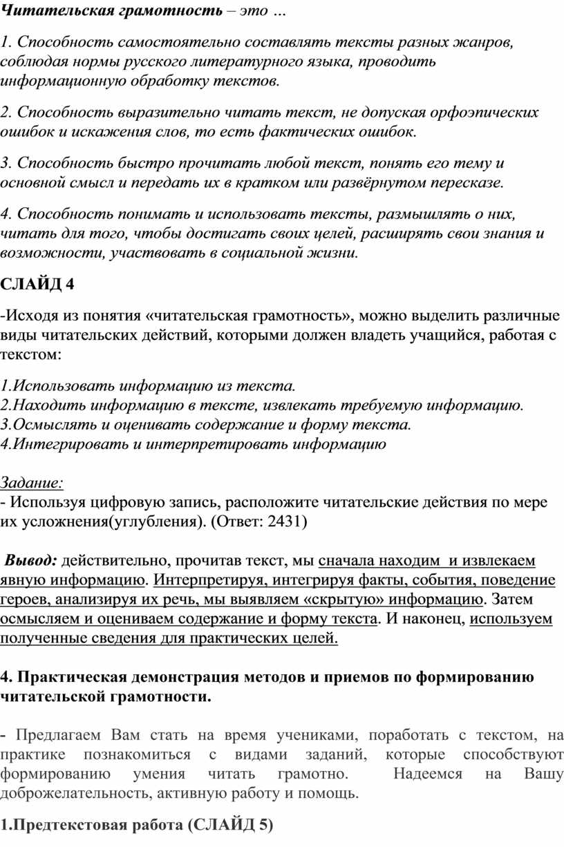 4. Практическая демонстрация различных видов читательских действий по формированию читательской грамотности.