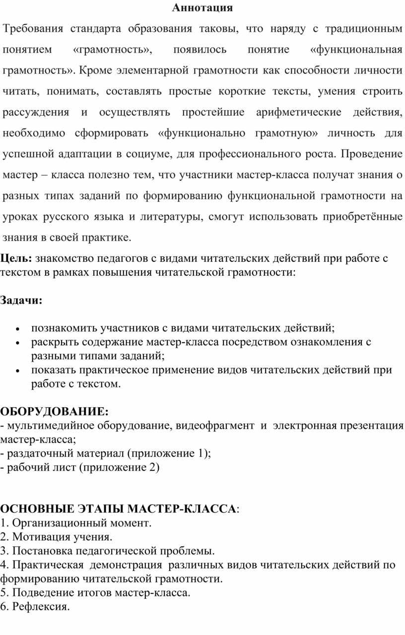 Требования стандарта образования таковы, что наряду с традиционным понятием «грамотность», появилось понятие «функциональная грамотность». Кроме элементарной грамотности как способности личности читать, понимать, составлять простые короткие тексты, умения строить рассуждения и осуществлять простейшие арифметические действия, необходимо сформировать «функционально грамотную» личность для успешной адаптации в социуме, для профессионального роста. Проведение мастер – класса полезно тем, что участники мастер-класса получат знания о разных типах заданий по формированию функциональной грамотности на уроках русского языка и литературы, смогут использовать приобретённые знания в своей практике.