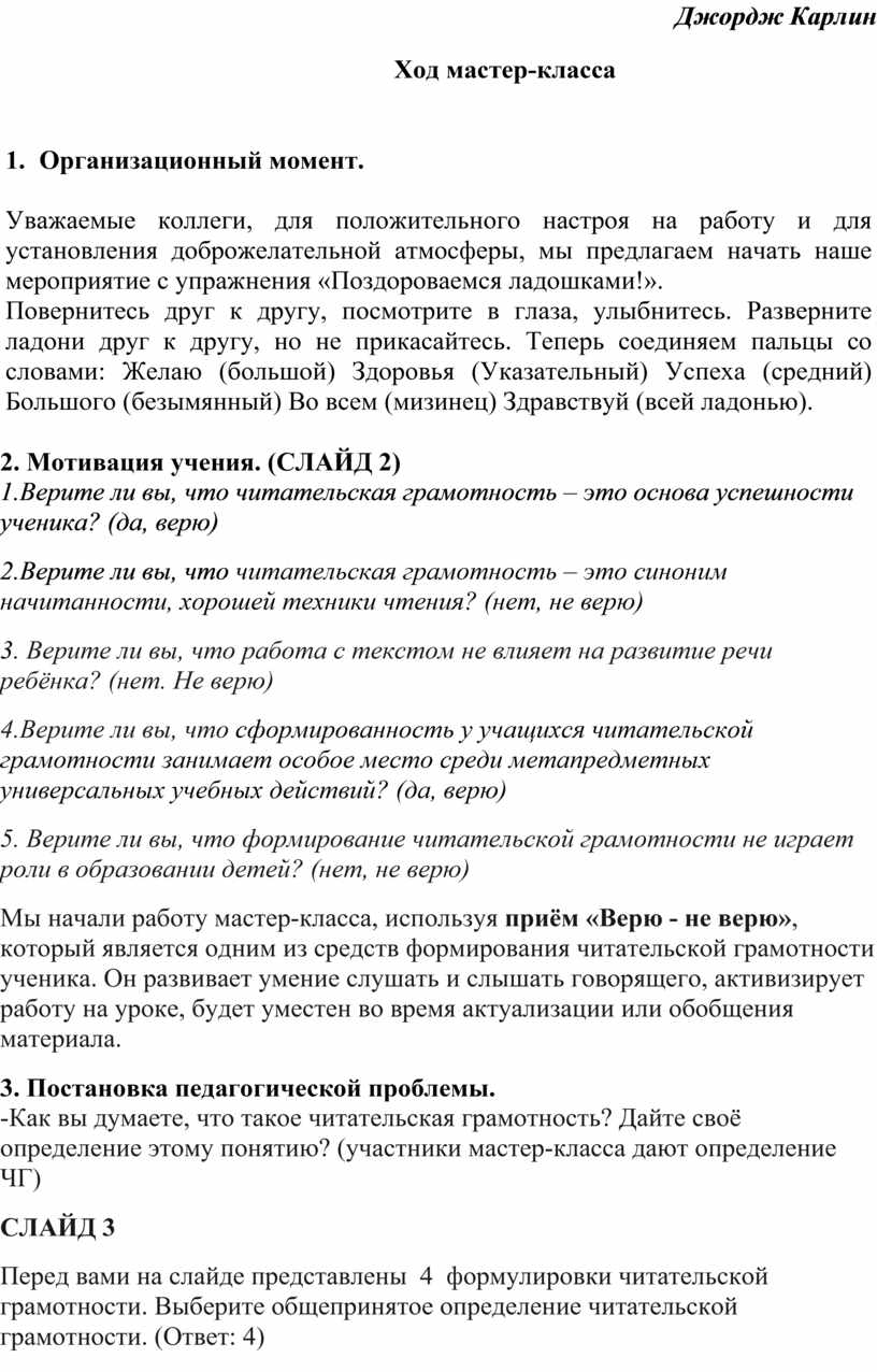 Мы начали работу мастер-класса, используя приём «Верю - не верю», который является одним из средств формирования читательской грамотности ученика. Он развивает умение слушать и слышать говорящего, активизирует работу на уроке, будет уместен во время актуализации или обобщения материала.