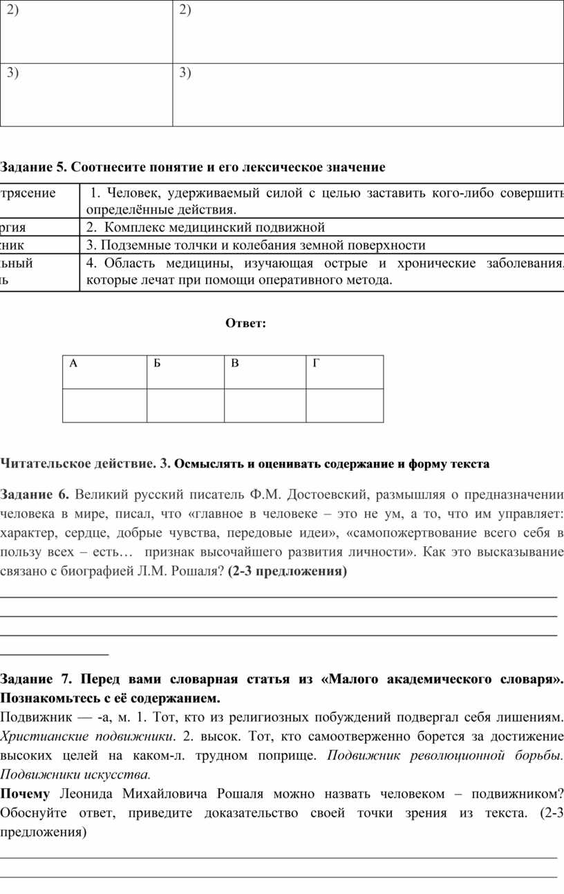 Задание 6. Великий русский писатель Ф.М. Достоевский, размышляя о предназначении человека в мире, писал, что «главное в человеке – это не ум, а то, что им управляет: характер, сердце, добрые чувства, передовые идеи», «самопожертвование всего себя в пользу всех – есть… признак высочайшего развития личности». Как это высказывание связано с биографией Л.М. Рошаля? (2-3 предложения)