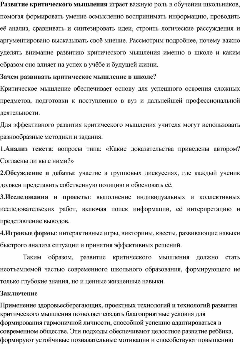Таким образом, развитие критического мышления должно стать неотъемлемой частью современного школьного образования, формирующего не только глубокие знания, но и ценные жизненные навыки.