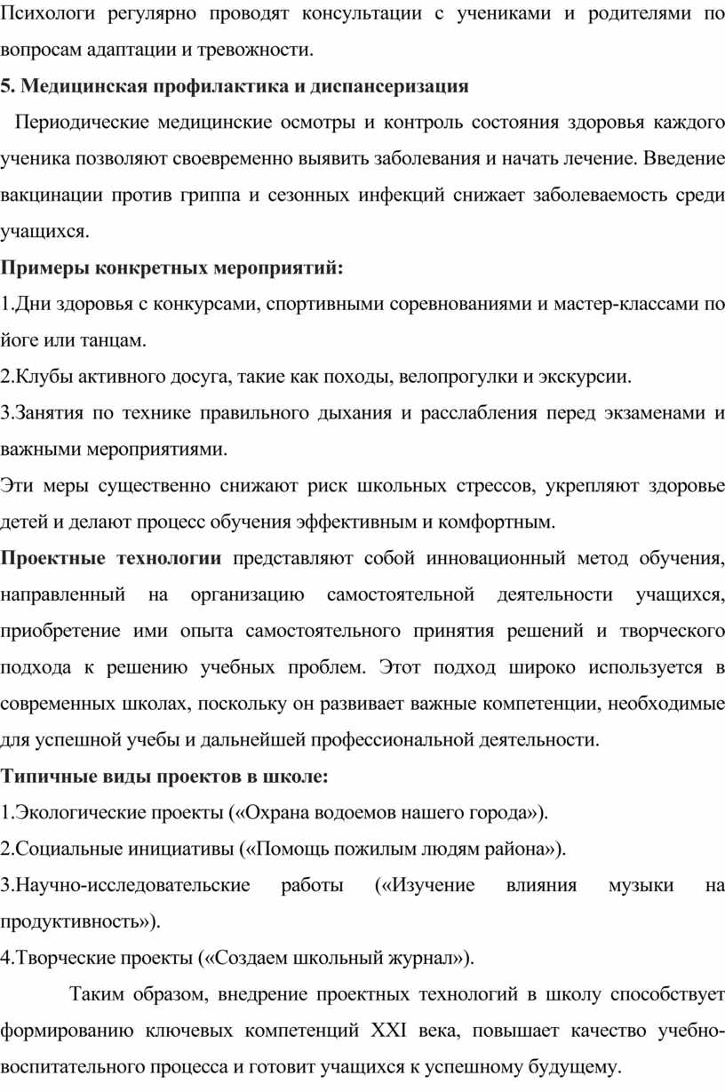 Внедрение методик профилактики стресса и эмоционального перенапряжения: использование техник релаксации, дыхательной гимнастики и арт-терапии. Психологи регулярно проводят консультации с учениками и родителями по вопросам адаптации и тревожности.