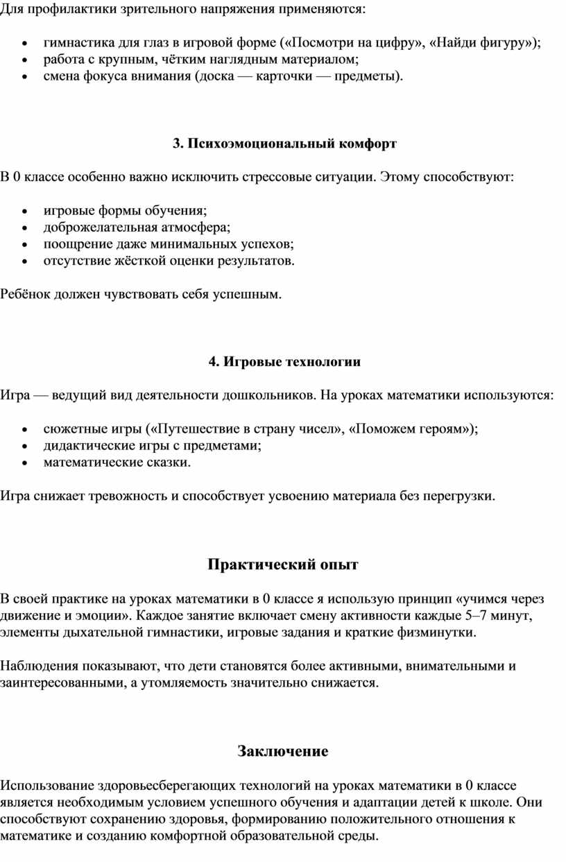 Использование здоровьесберегающих технологий на уроках математики в 0 классе является необходимым условием успешного обучения и адаптации детей к школе. Они способствуют сохранению здоровья, формированию положительного отношения к математике и созданию комфортной образовательной среды.
