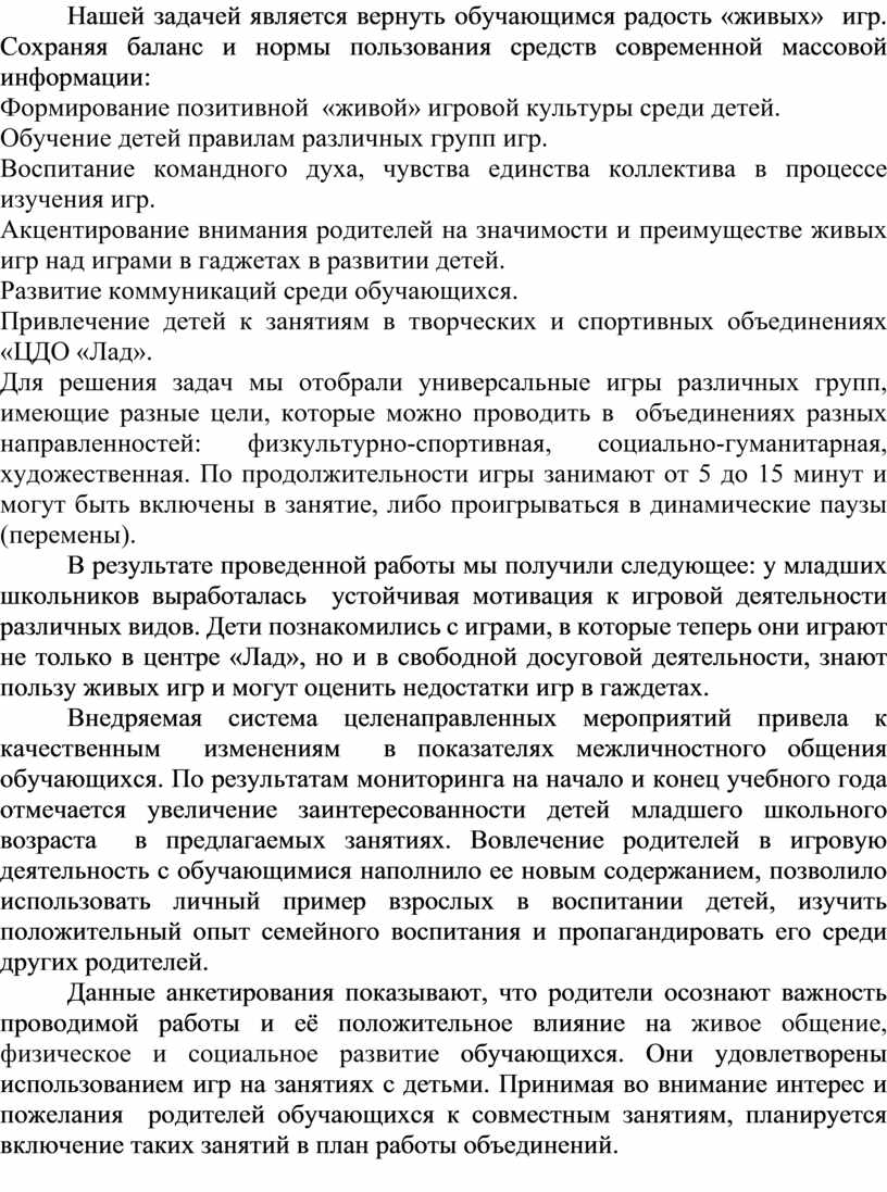 Нашей задачей является вернуть обучающимся радость «живых» игр. Сохраняя баланс и нормы пользования средств современной массовой информации: