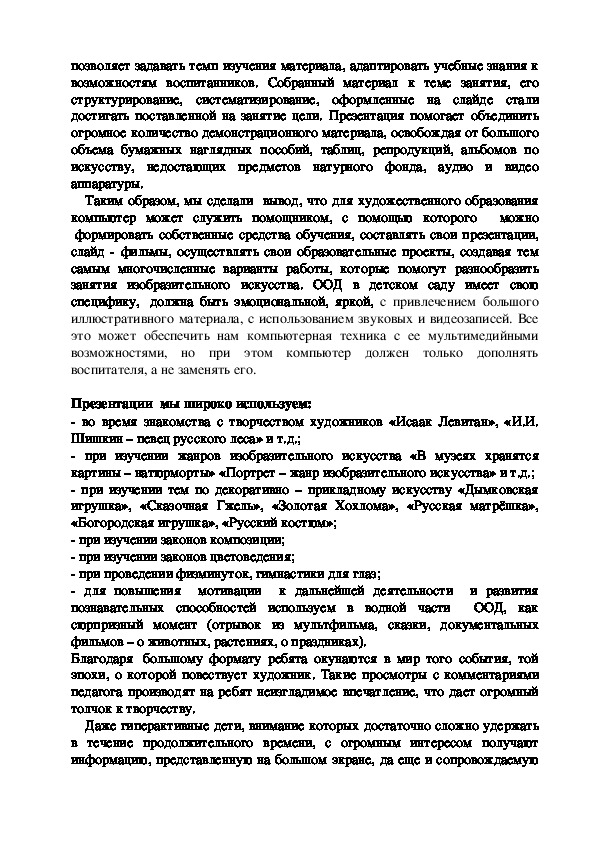 В статье говорится о том, как можно использовать ИКТ в работе с дошкольниками, какие задачи ставятся в организационно- образовательной деятельности, говорится о преимуществах использования ИКТ в работе педагога, приводятся примеры презентаций используемых на занятиях по изодеятельности в разных возрастных группах детского сада.