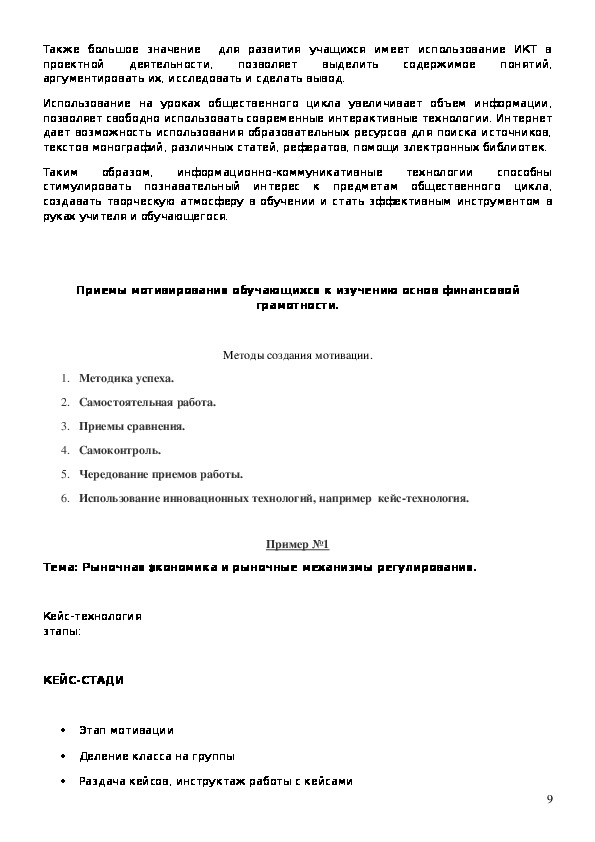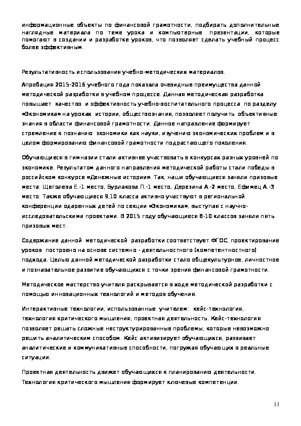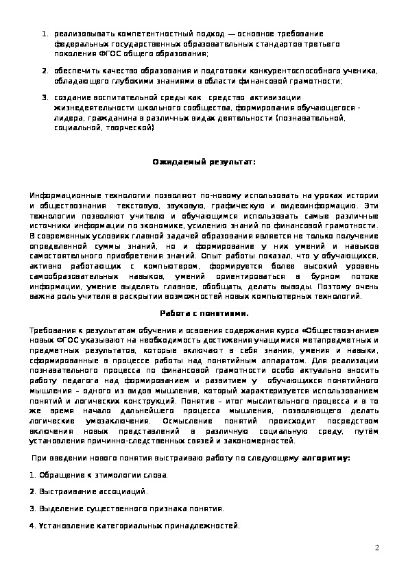 Данная методическая разработка повышает качество и эффективность учебно-воспитательного процесса по разделу «Экономика» на уроках истории, обществознания, позволяет получить объективные знания в области финансовой грамотности. Данное направление формирует стремление к познанию экономики как науки, изучению экономических проблем и в целом формированию финансовой грамотности подрастающего поколения. Содержание данной методической разработки соответствует ФГОС, проектирование уроков построено на основе системно - деятельностного (компетентностного) подхода. Целью данной методической разработки стало общекультурное, личностное и познавательное развитие обучающихся с точки зрения финансовой грамотности.
