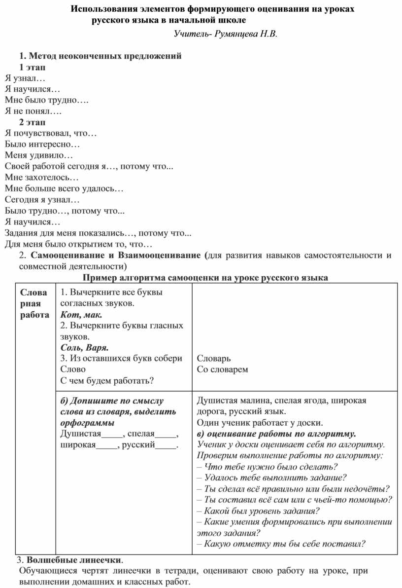 Использования элементов формирующего оценивания на уроках русского языка в начальной школе