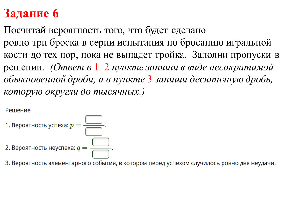 Посчитай вероятность того, что будет сделано ровно три броска в серии испытания по бросанию игральной кости до тех пор, пока не выпадет тройка. Заполни пропуски в решении. (Ответ в 1, 2 пункте запиши в виде несократимой обыкновенной дроби, а в пункте 3 запиши десятичную дробь, которую округли до тысячных.)