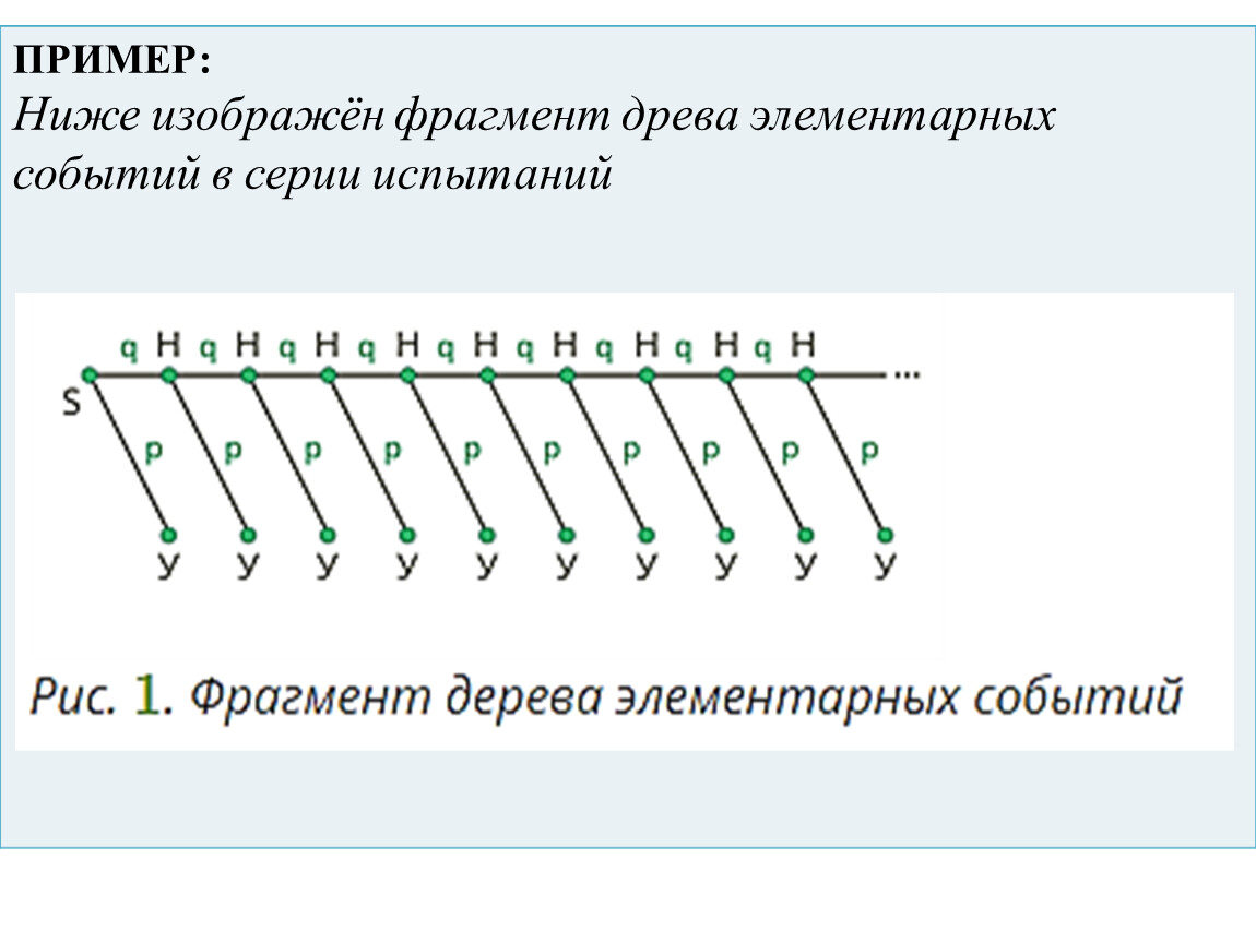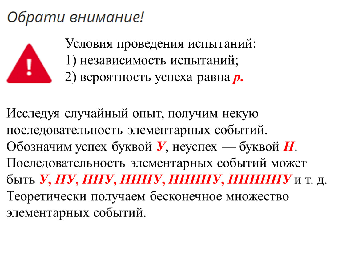 Обозначим успех буквой У, неуспех — буквой Н. Последовательность элементарных событий может быть У, НУ, ННУ, НННУ, ННННУ, НННННУ и т. д. Теоретически получаем бесконечное множество элементарных событий.