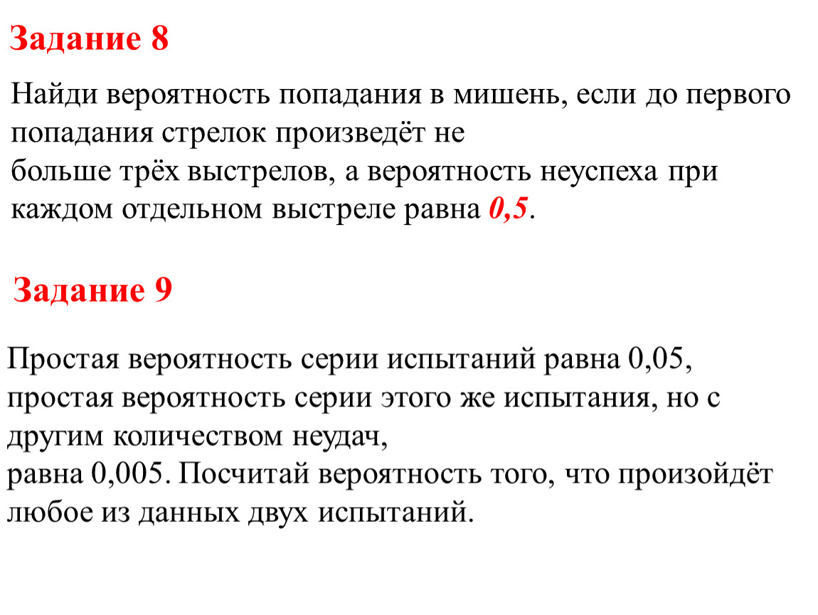Найди вероятность попадания в мишень, если до первого попадания стрелок произведёт не больше трёх выстрелов, а вероятность неуспеха при каждом отдельном выстреле равна 0,5.
