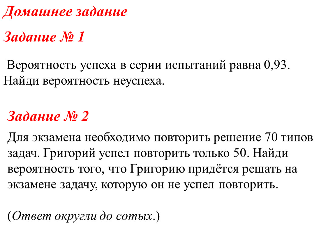 Для экзамена необходимо повторить решение 70 типов задач. Григорий успел повторить только 50. Найди вероятность того, что Григорию придётся решать на экзамене задачу, которую он не успел повторить.