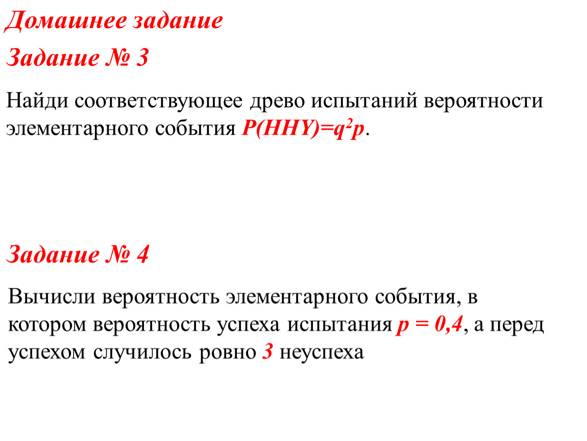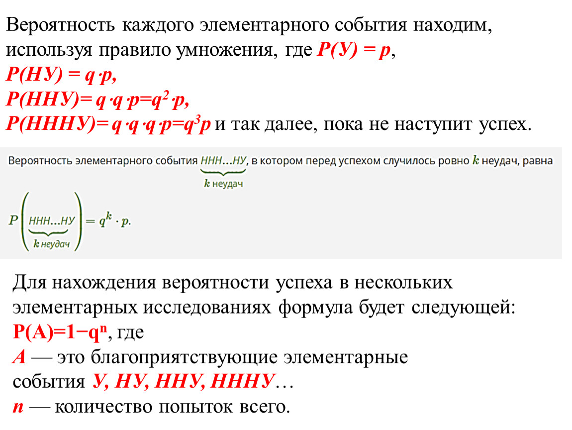 P(НННУ)= q⋅q⋅q⋅p=q3p и так далее, пока не наступит успех.