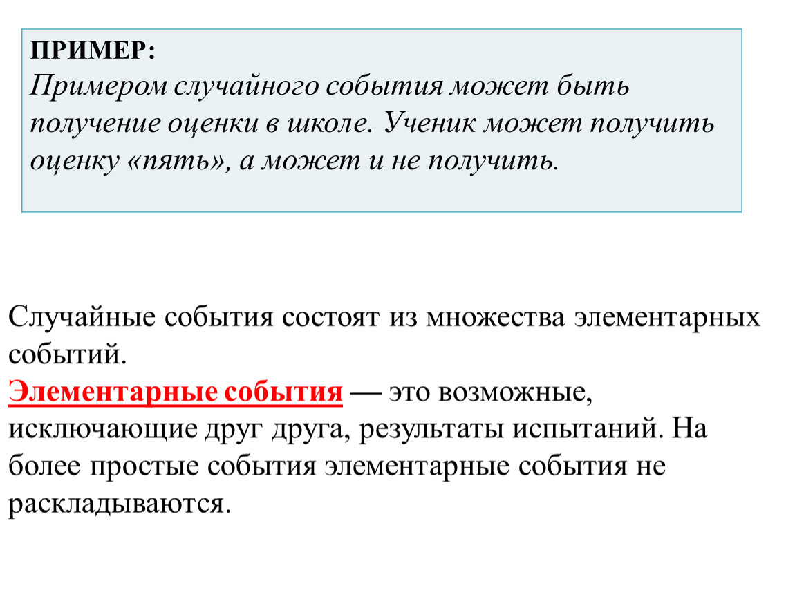 Элементарные события — это возможные, исключающие друг друга, результаты испытаний. На более простые события элементарные события не раскладываются.