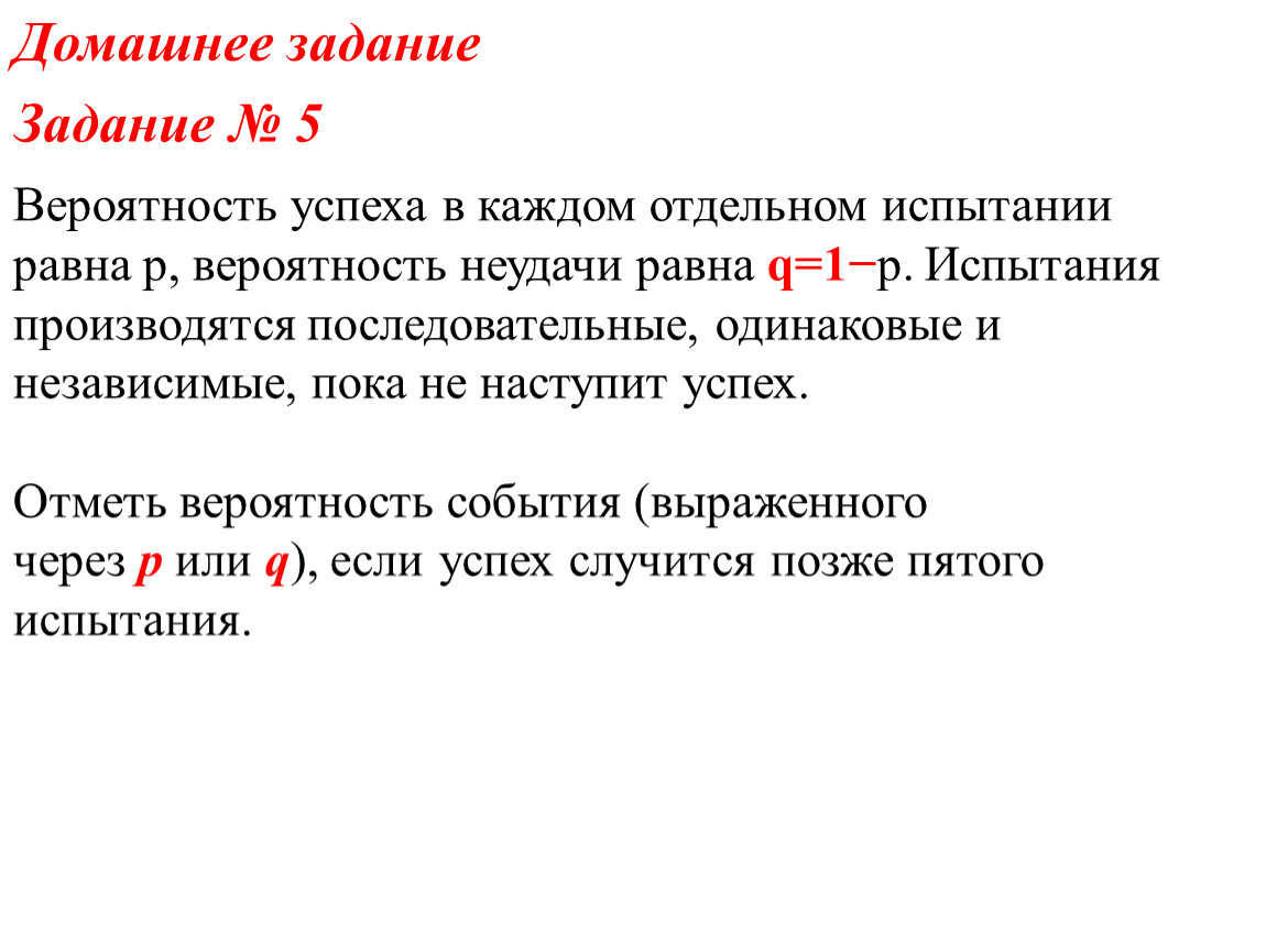 Отметь вероятность события (выраженного через p или q), если успех случится позже пятого испытания.