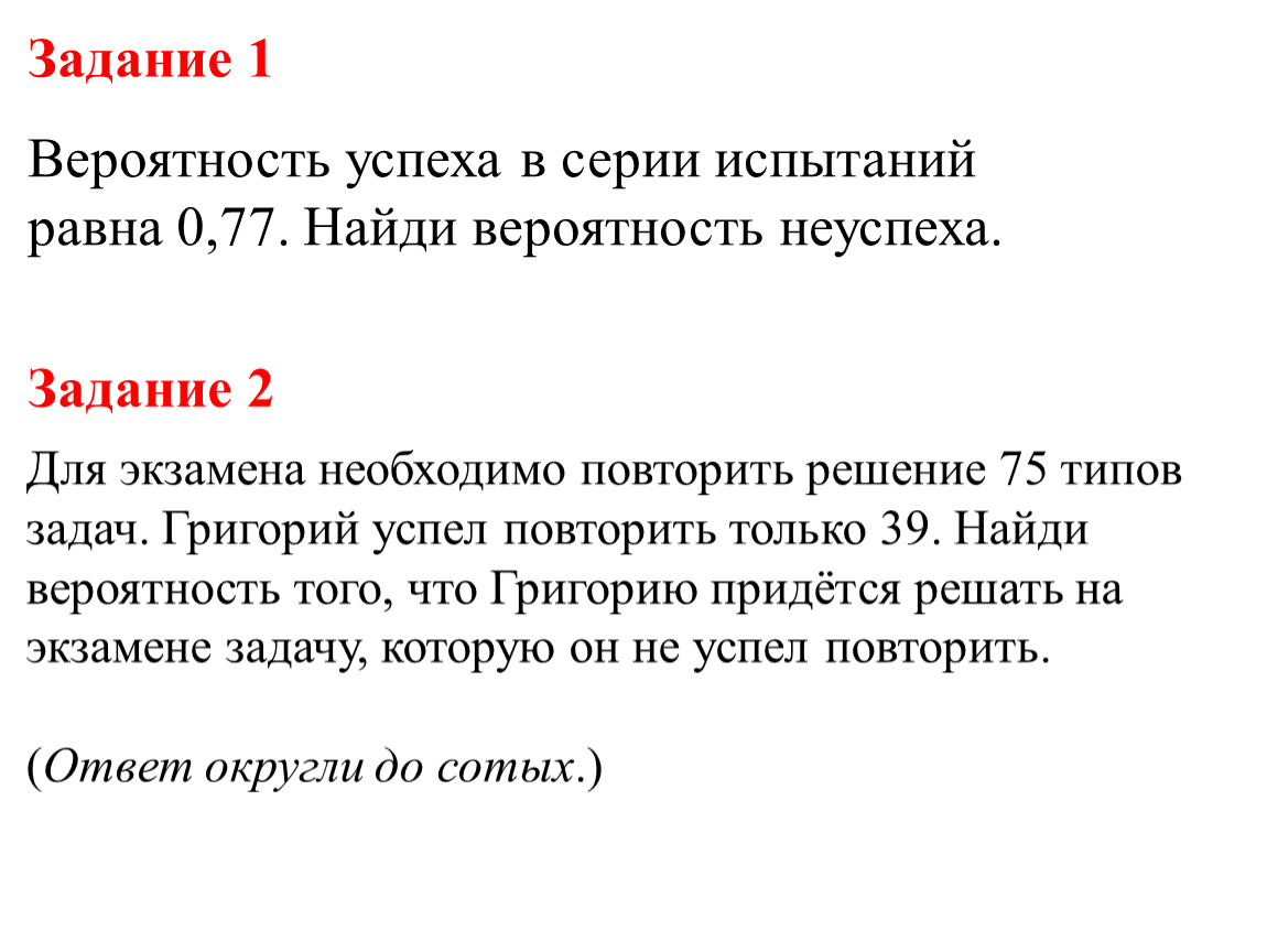 Для экзамена необходимо повторить решение 75 типов задач. Григорий успел повторить только 39. Найди вероятность того, что Григорию придётся решать на экзамене задачу, которую он не успел повторить.