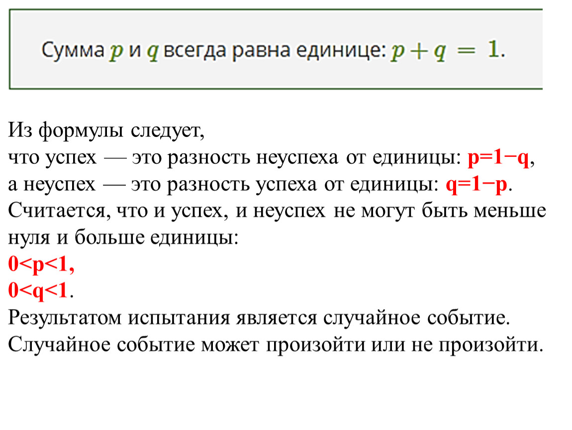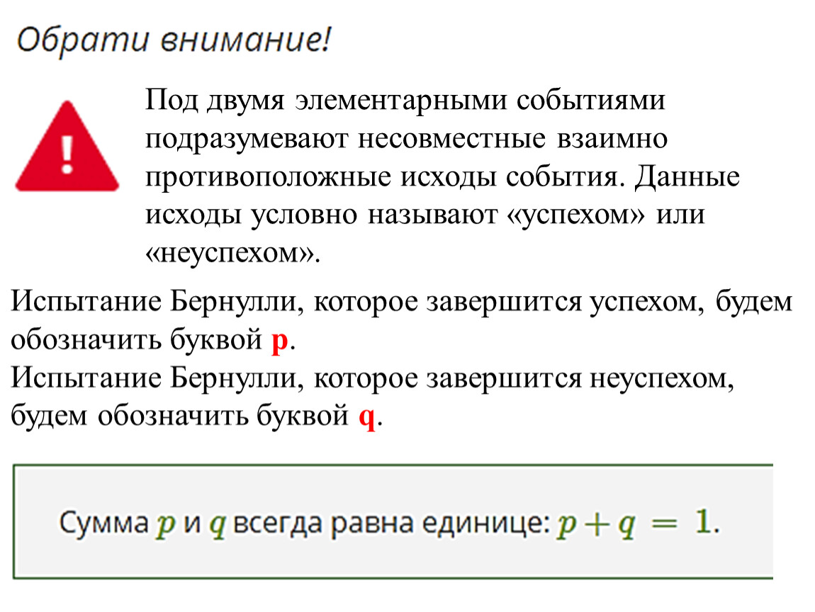 Под двумя элементарными событиями подразумевают несовместные взаимно противоположные исходы события. Данные исходы условно называют «успехом» или «неуспехом».