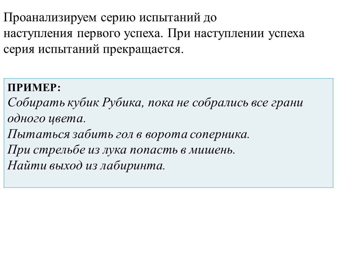 Проанализируем серию испытаний до наступления первого успеха. При наступлении успеха серия испытаний прекращается.