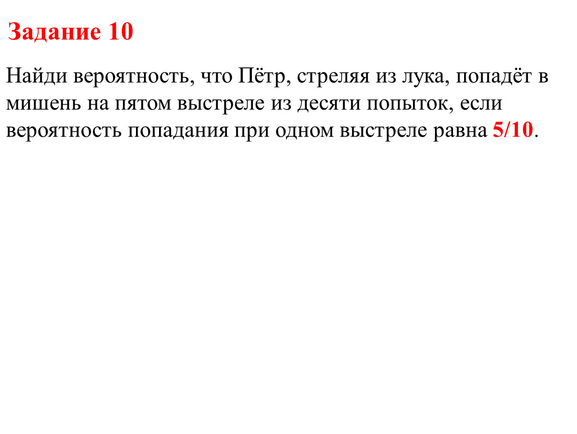 Найди вероятность, что Пётр, стреляя из лука, попадёт в мишень на пятом выстреле из десяти попыток, если вероятность попадания при одном выстреле равна 5/10.