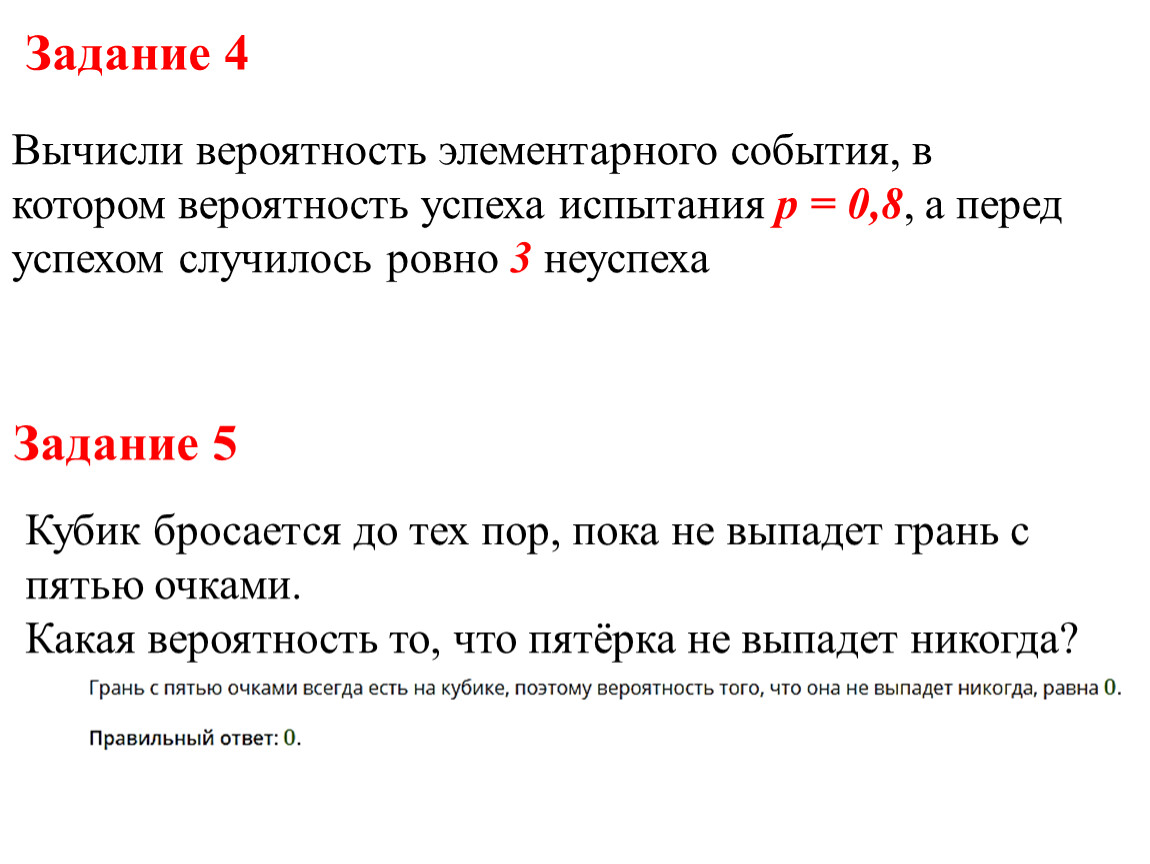 Вычисли вероятность элементарного события, в котором вероятность успеха испытания p = 0,8, а перед успехом случилось ровно 3 неуспеха