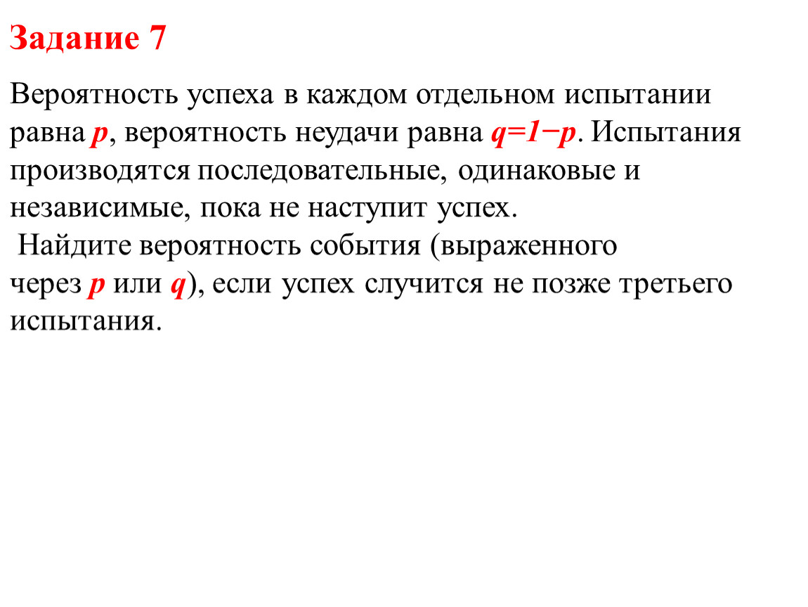 Найдите вероятность события (выраженного через p или q), если успех случится не позже третьего испытания.