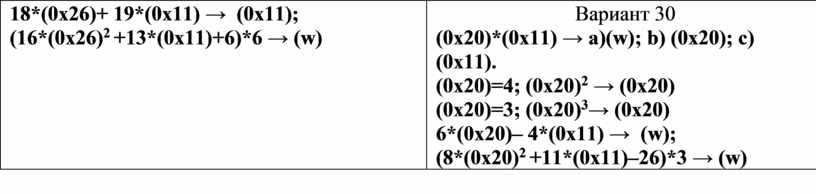 Вариант 30 (0x20)*(0x11) → a)(w); b) (0x20); c) (0x11). (0x20)=4; (0x20)2 → (0x20) (0x20)=3; (0x20)3→ (0x20) 6*(0x20)– 4*(0x11) → (w); (8*(0x20)2 +11*(0x11)–26)*3 → (w) |