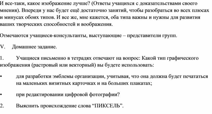 1. Учащиеся письменно в тетрадях отвечают на вопрос: Какой тип графического изображения (растровый или векторный) вы будете использовать: